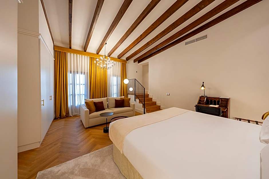 This large suite has a living room area. It features a full bathroom with a hot tub and spa bath.
